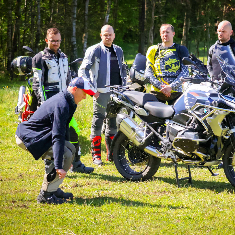- Ćwiczenia praktyczne – m.in. efektywne i bezpieczne podnoszenie motocykla w terenie
